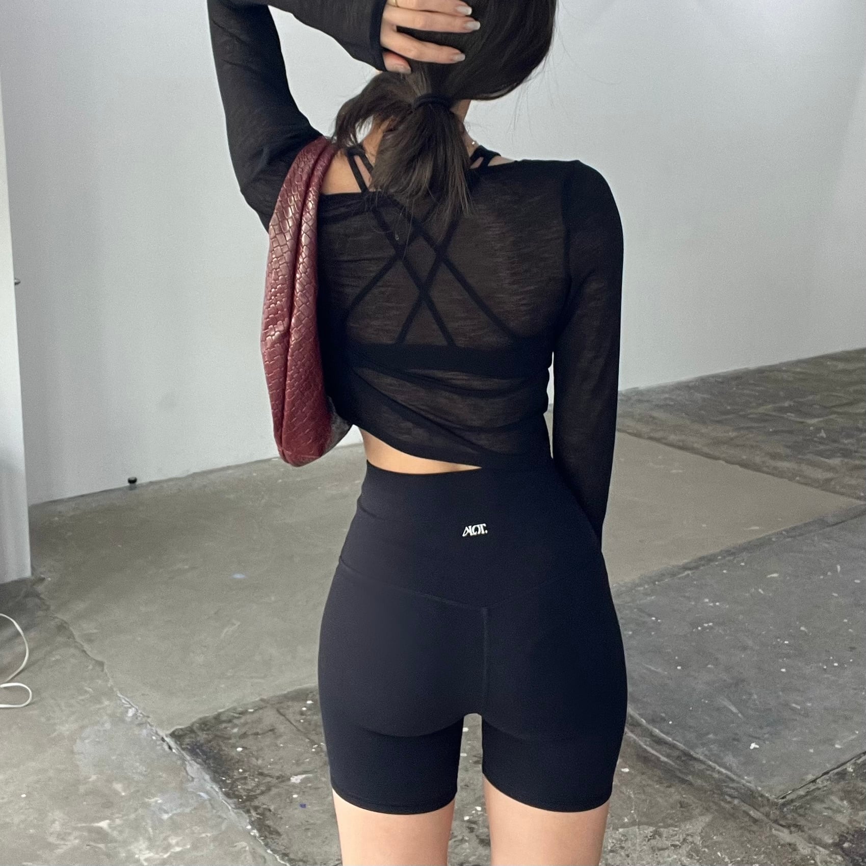 フロントはツイストディテールがアクセントに、バックにしてもシンプルで抜け感のある大人コーデに。