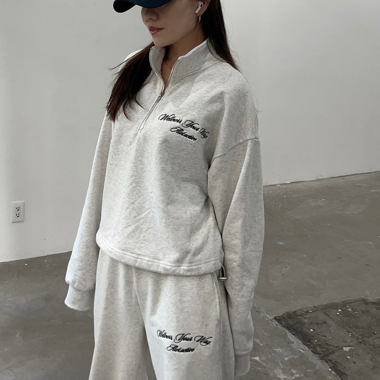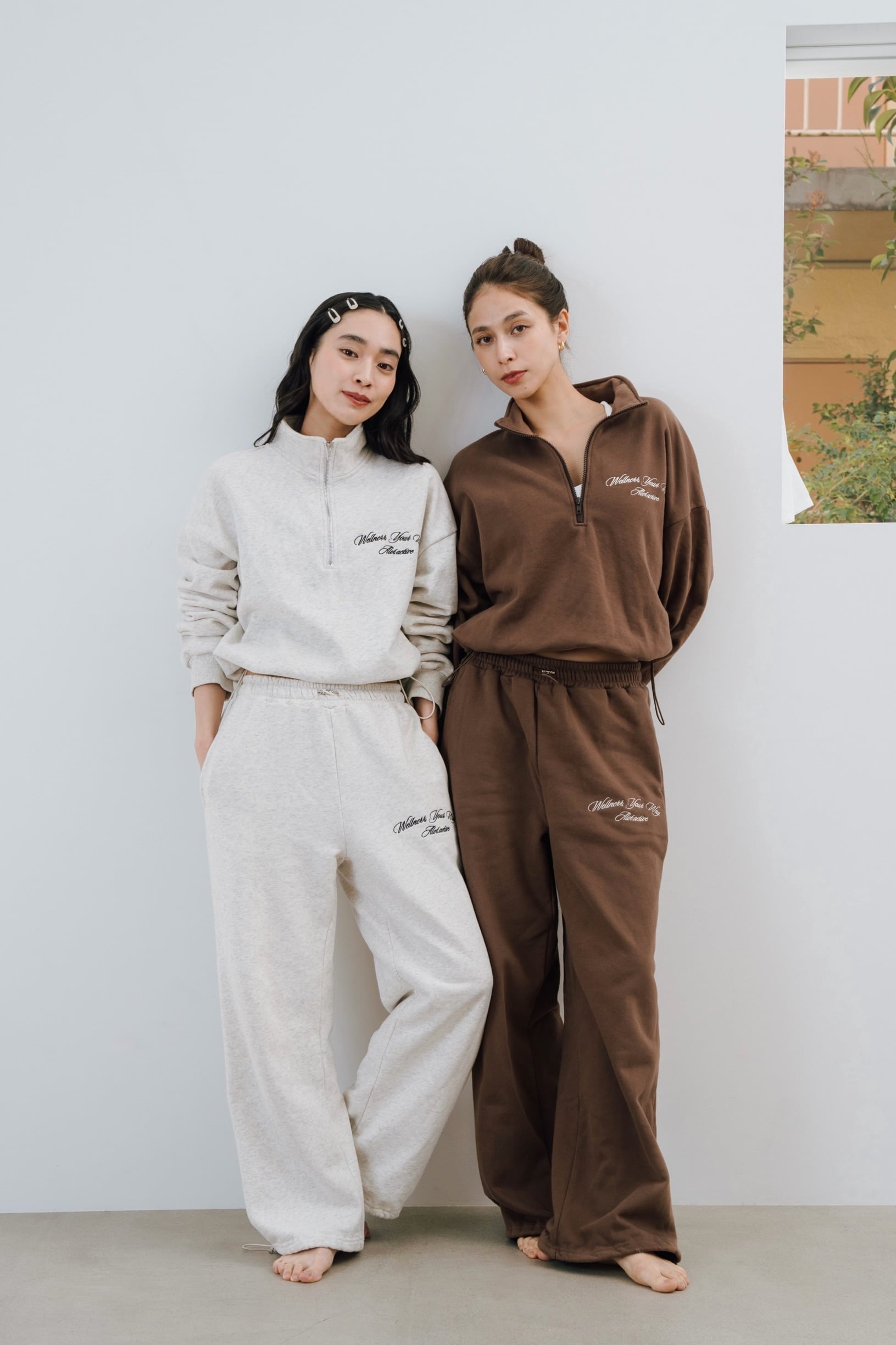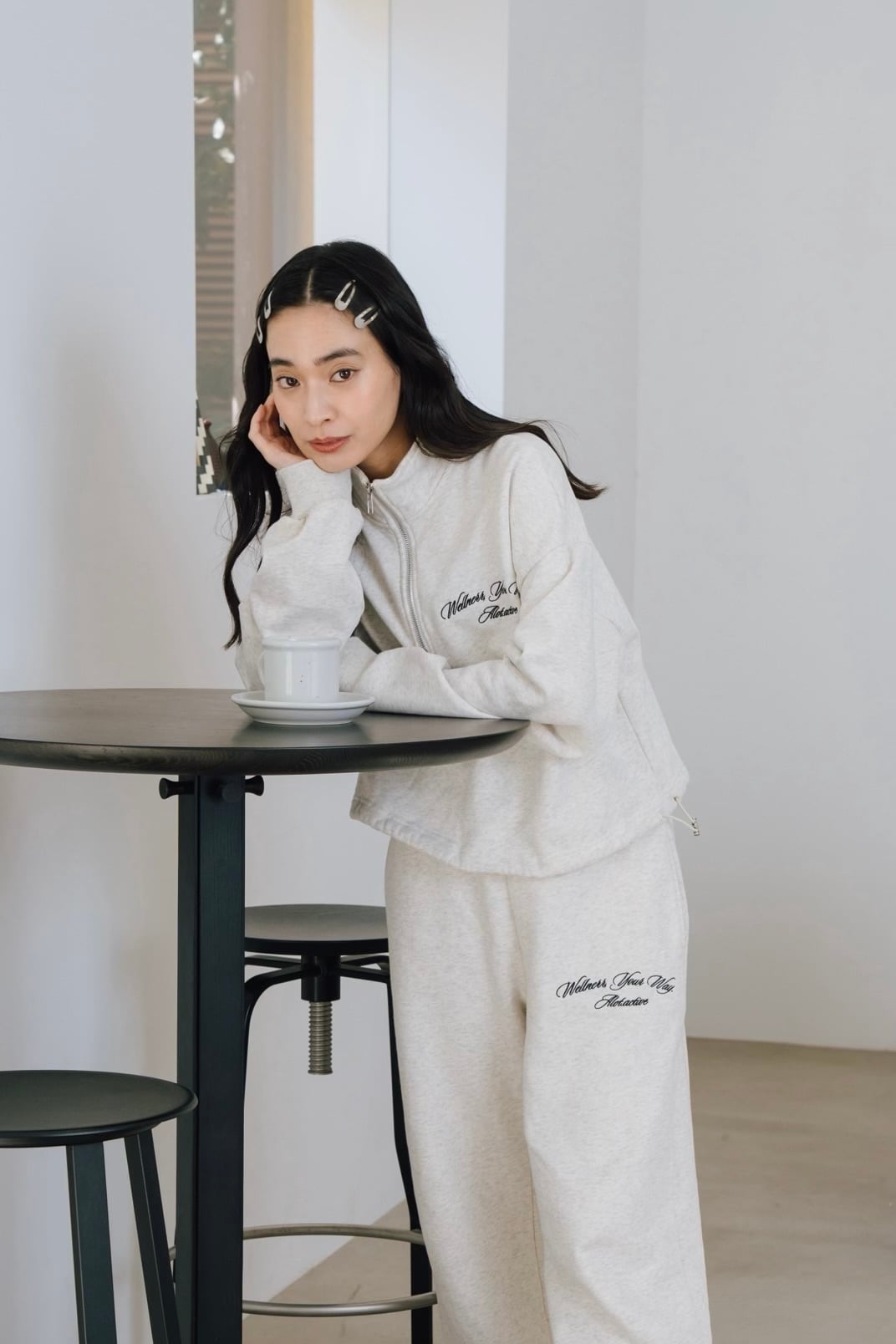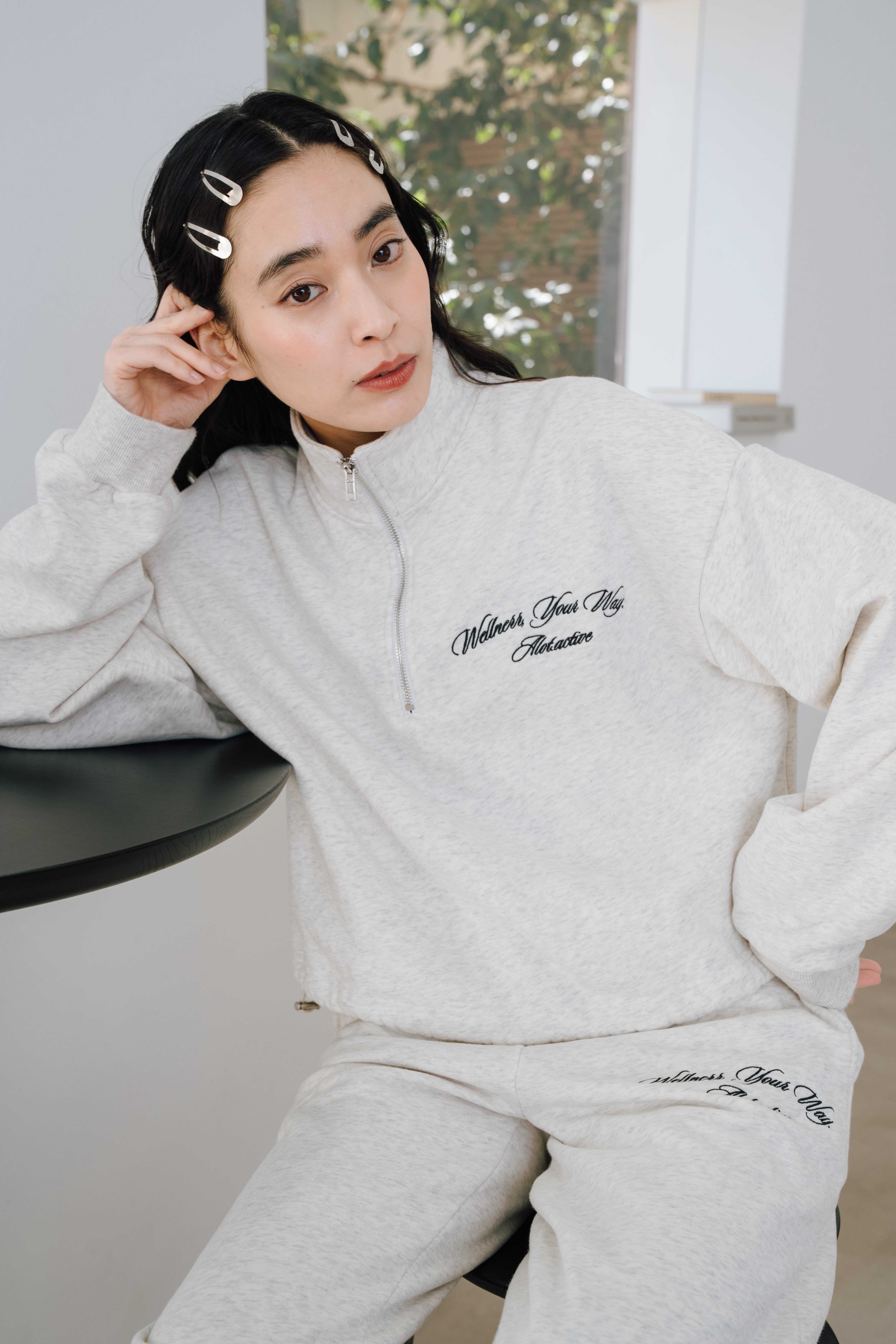 ハーフジップデザインのスウェットトップスとストレートシルエットのパンツを組み合わせた大人女性ためのセットアップ。