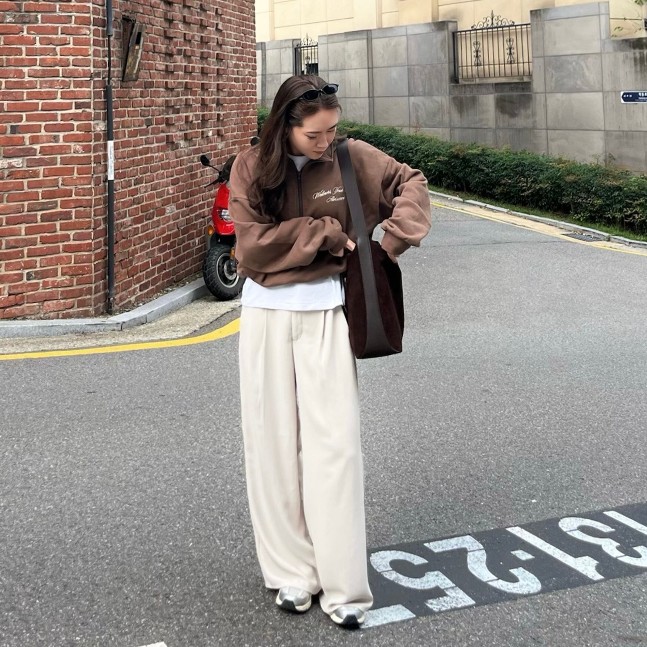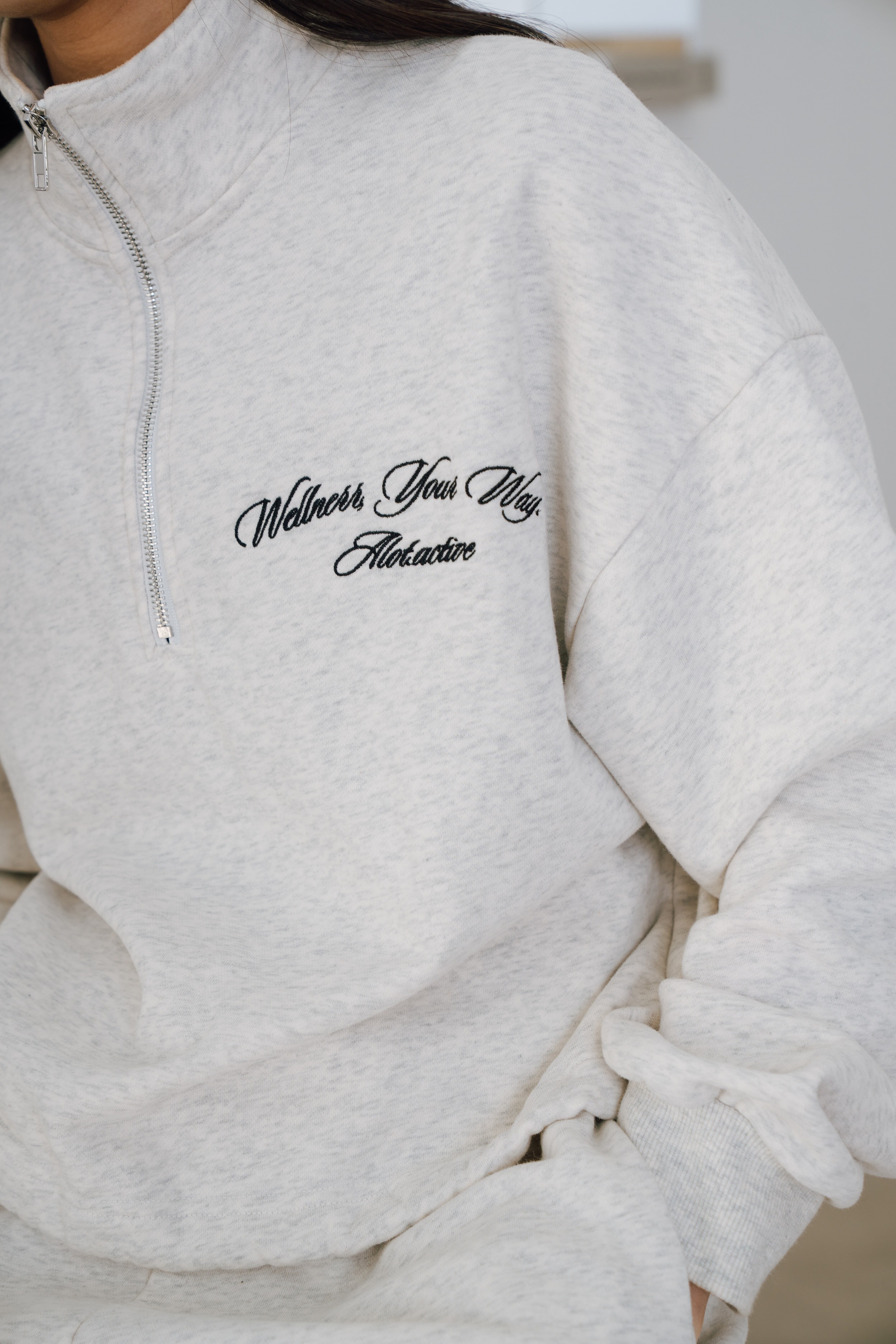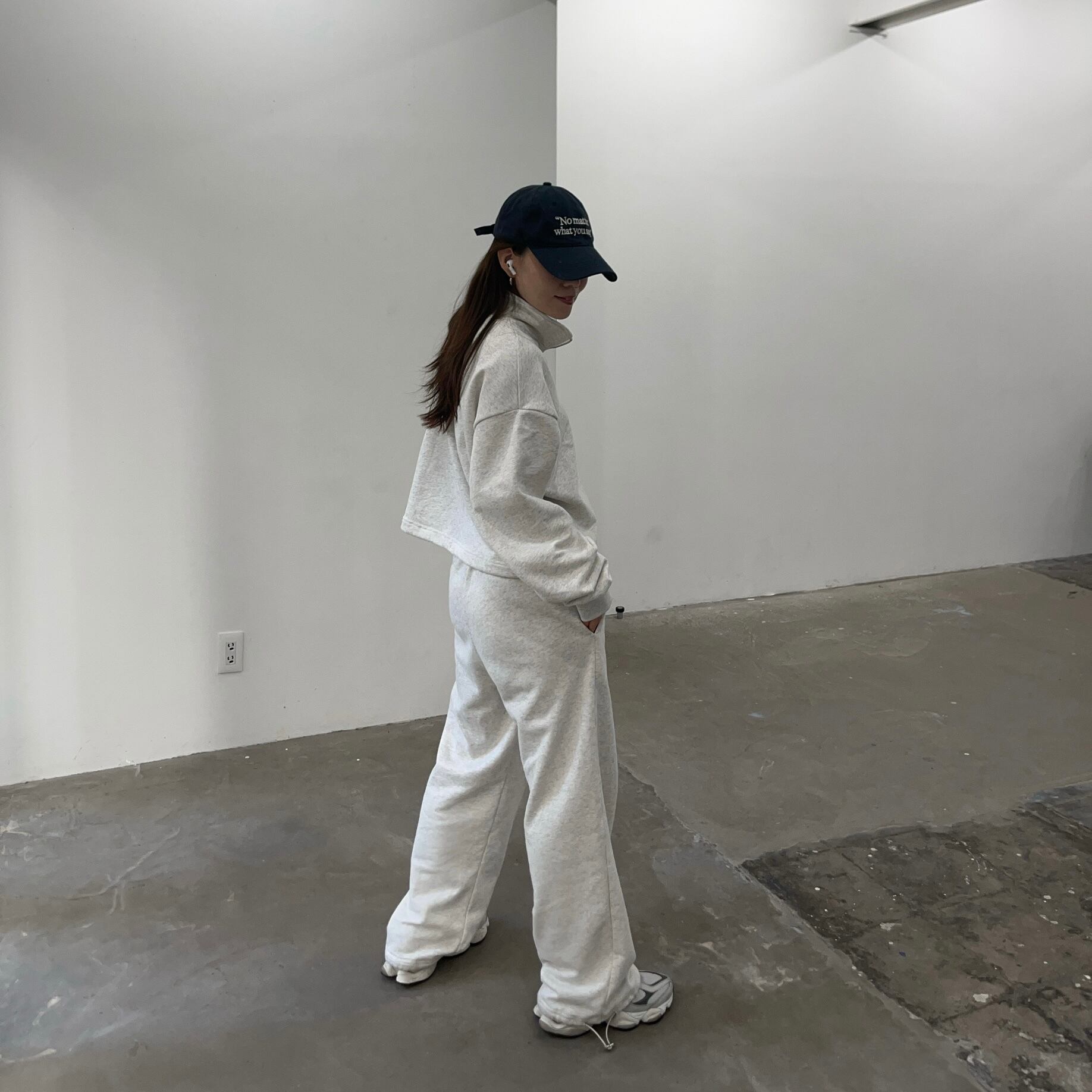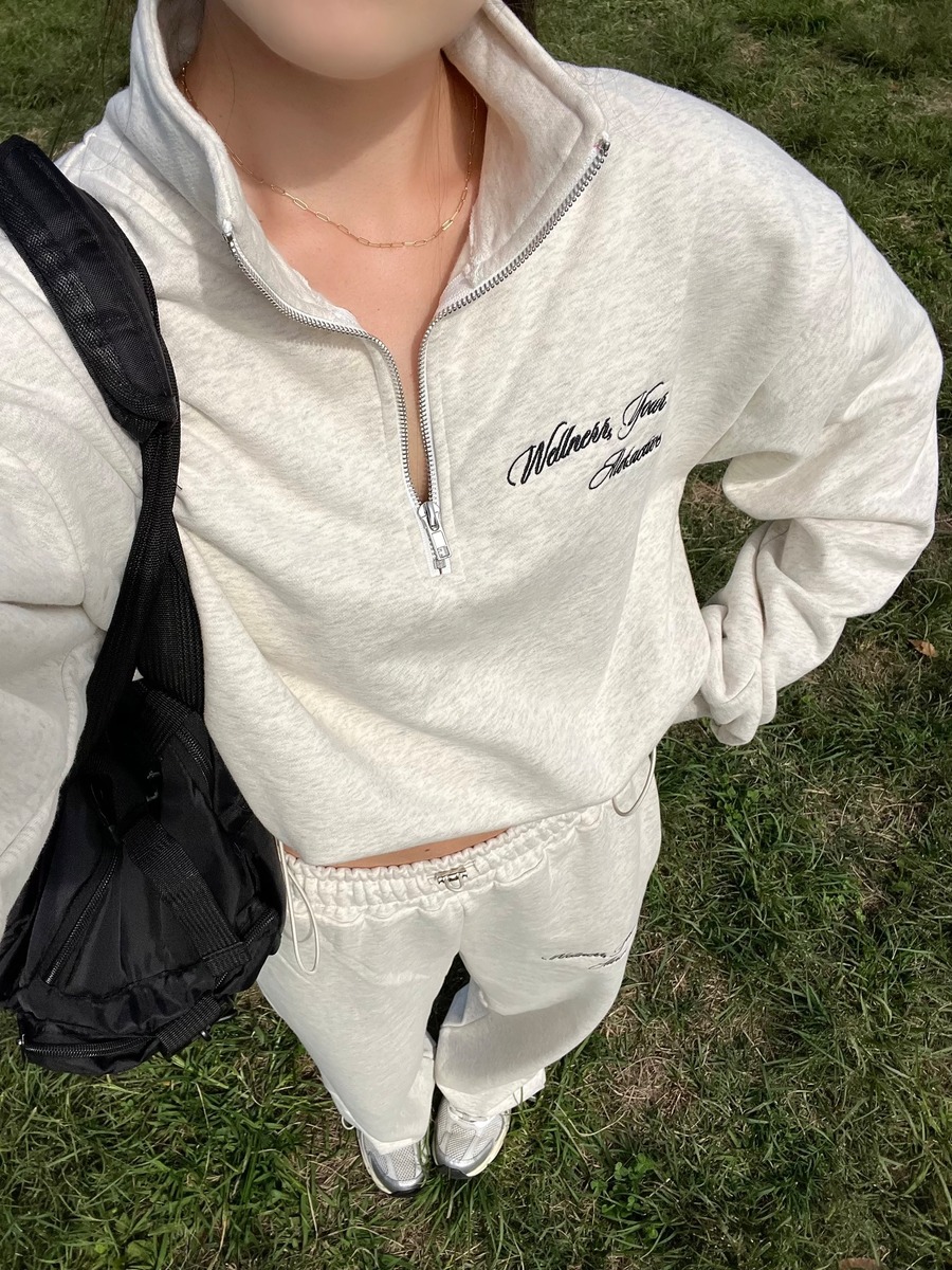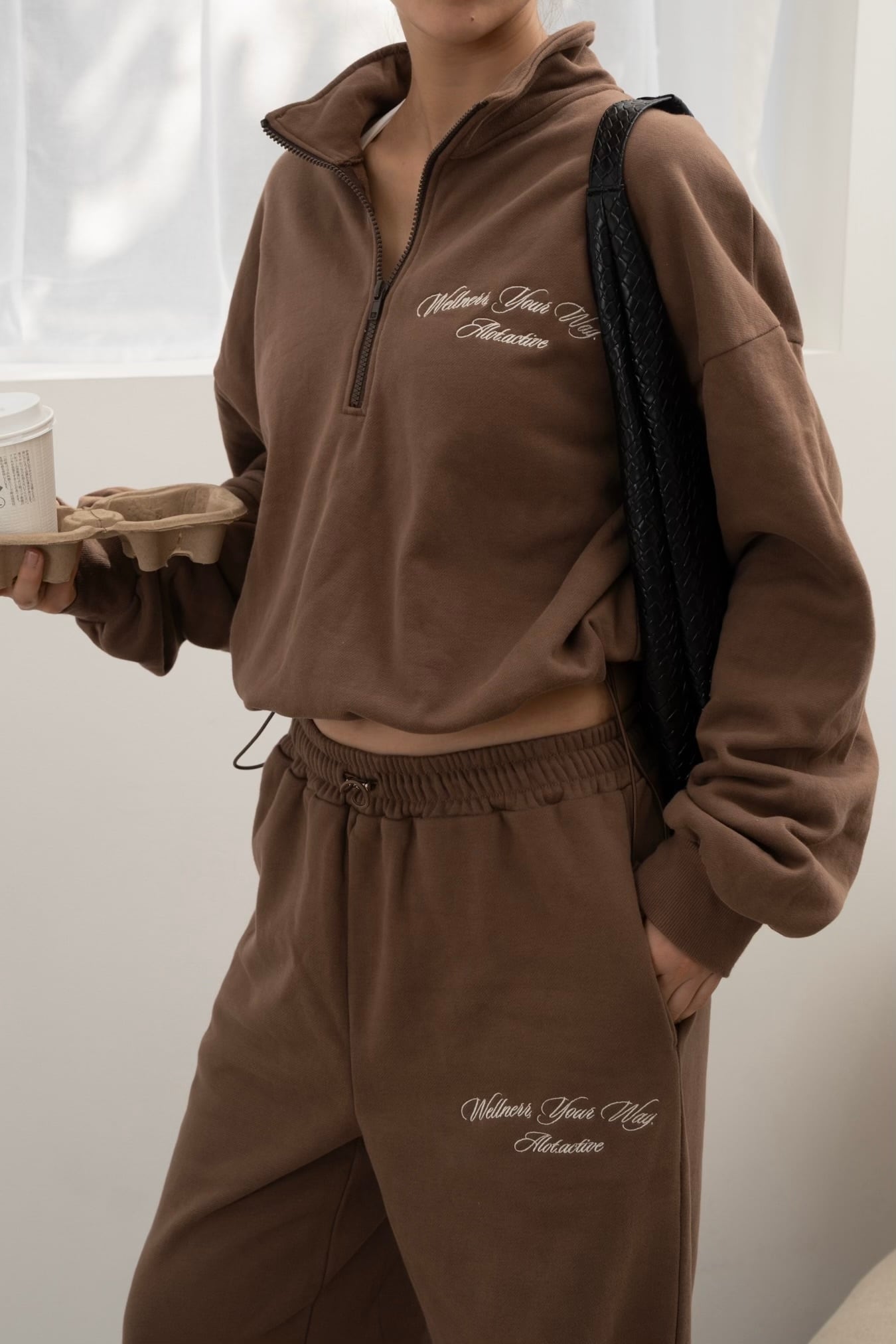 ハーフジップデザインのスウェットトップスとストレートシルエットのパンツを組み合わせた大人女性ためのセットアップ。