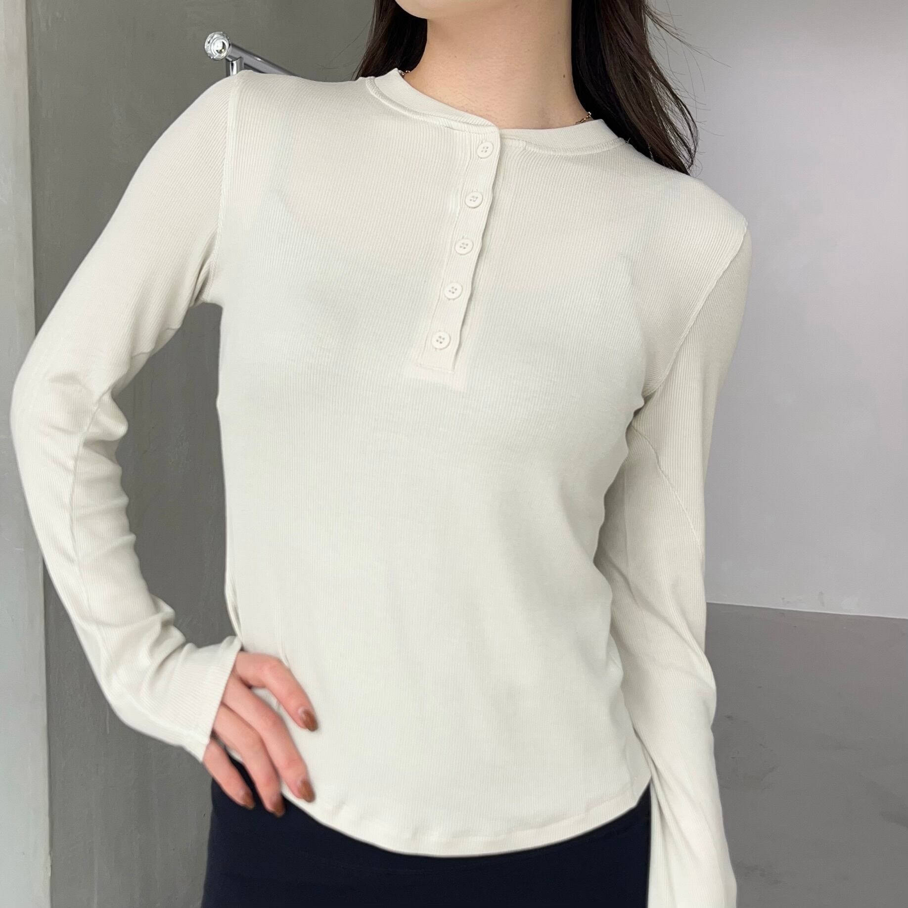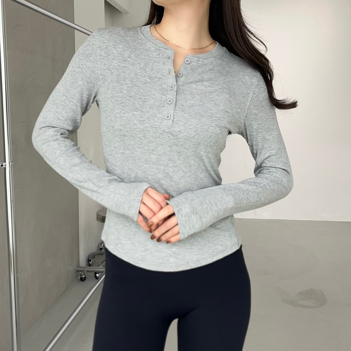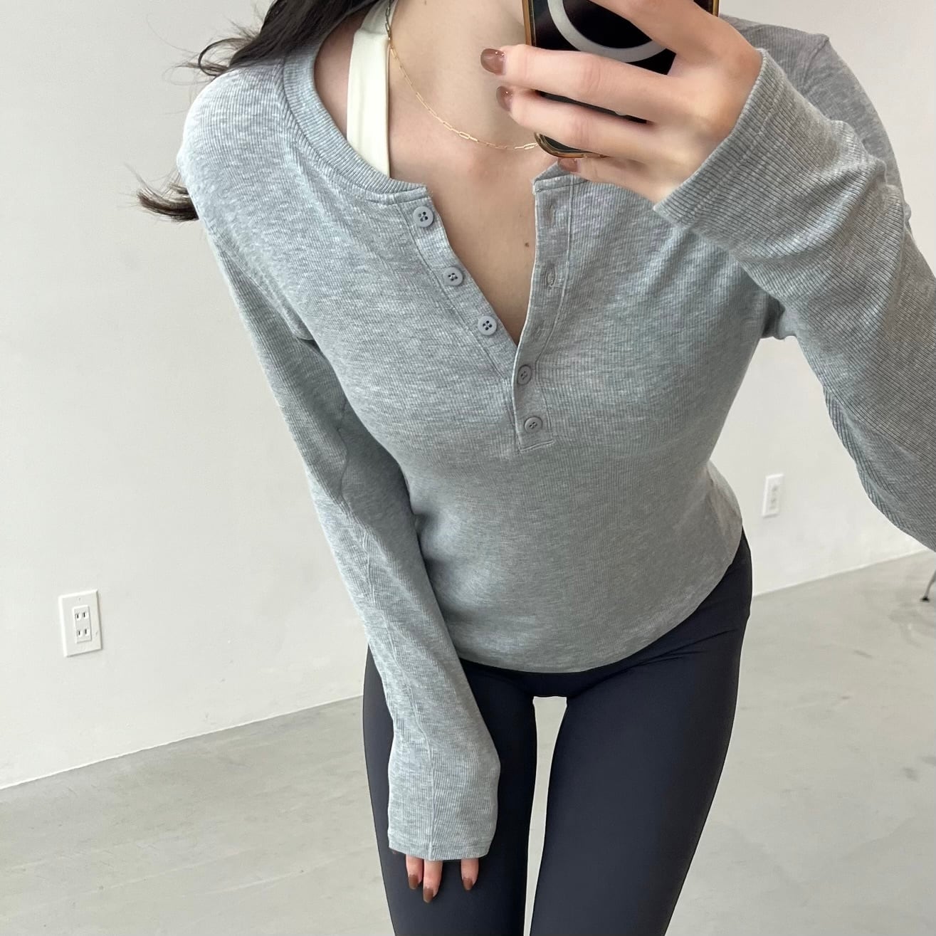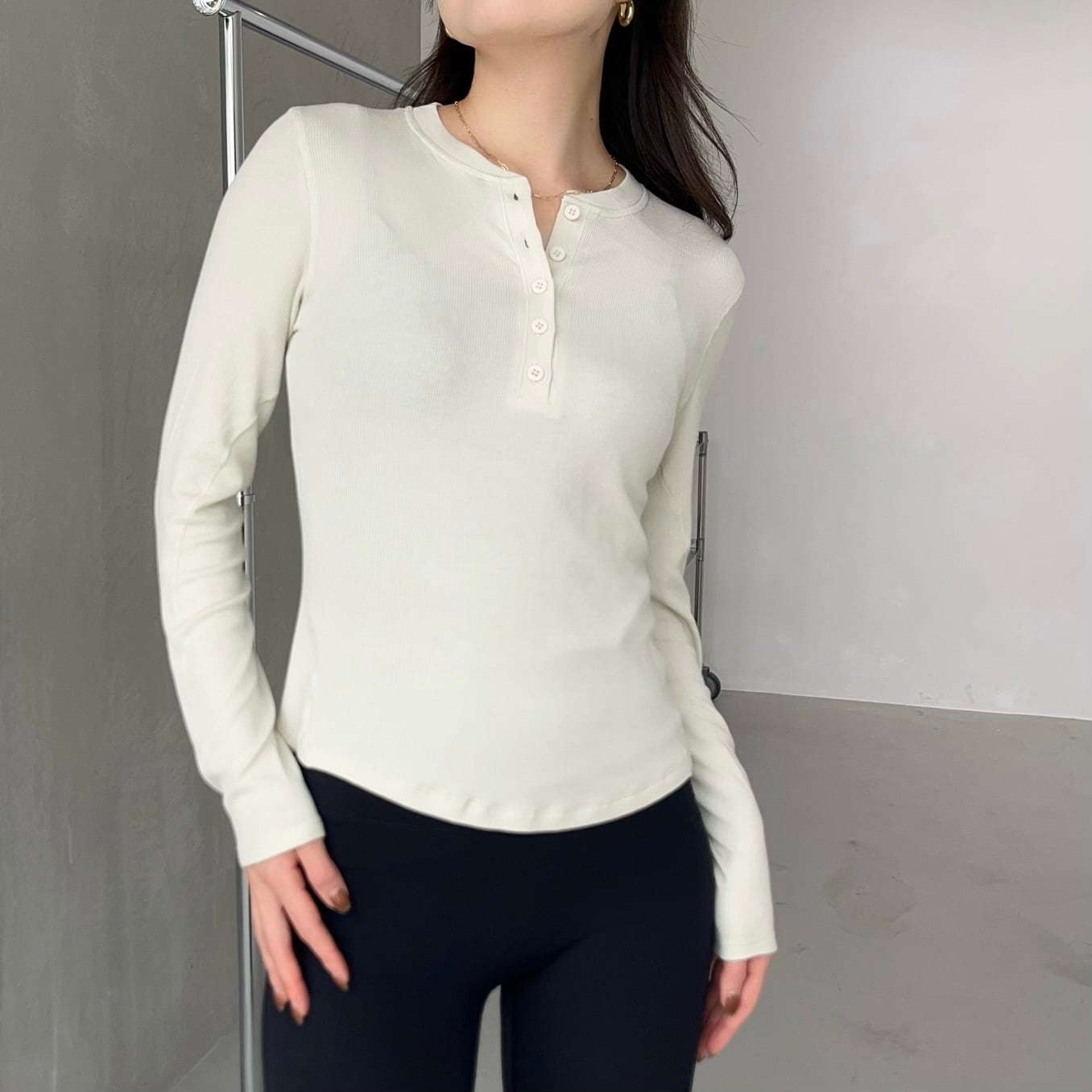 首もとのヘンリーネックは、カジュアルながらも気分でボタンを開ければ女性らしさが漂うデザイン。ワークアウトのあともそのまま外に出かけても◎