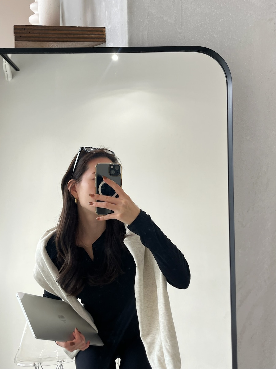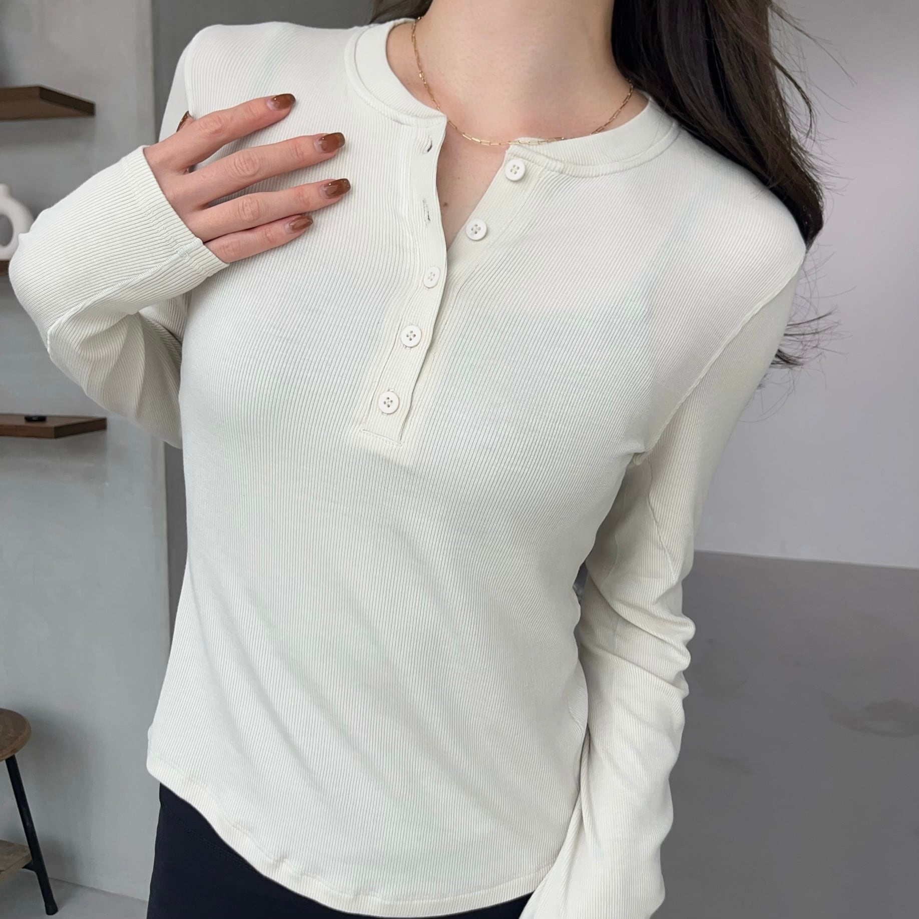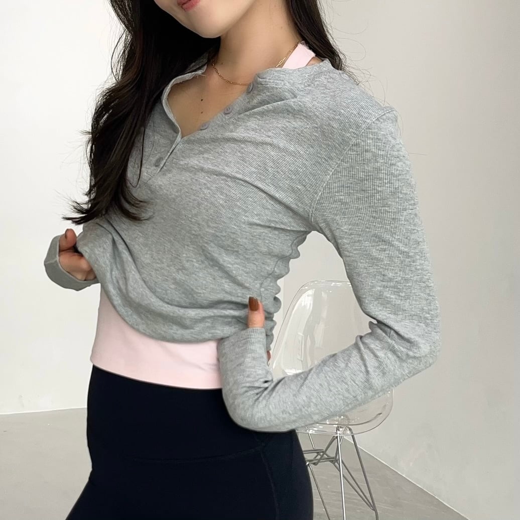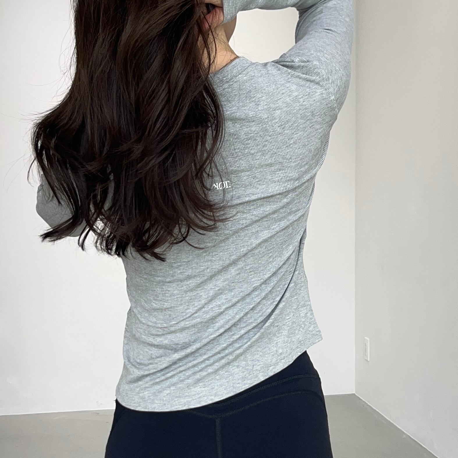 首もとのヘンリーネックは、カジュアルながらも気分でボタンを開ければ女性らしさが漂うデザイン。ワークアウトのあともそのまま外に出かけても◎